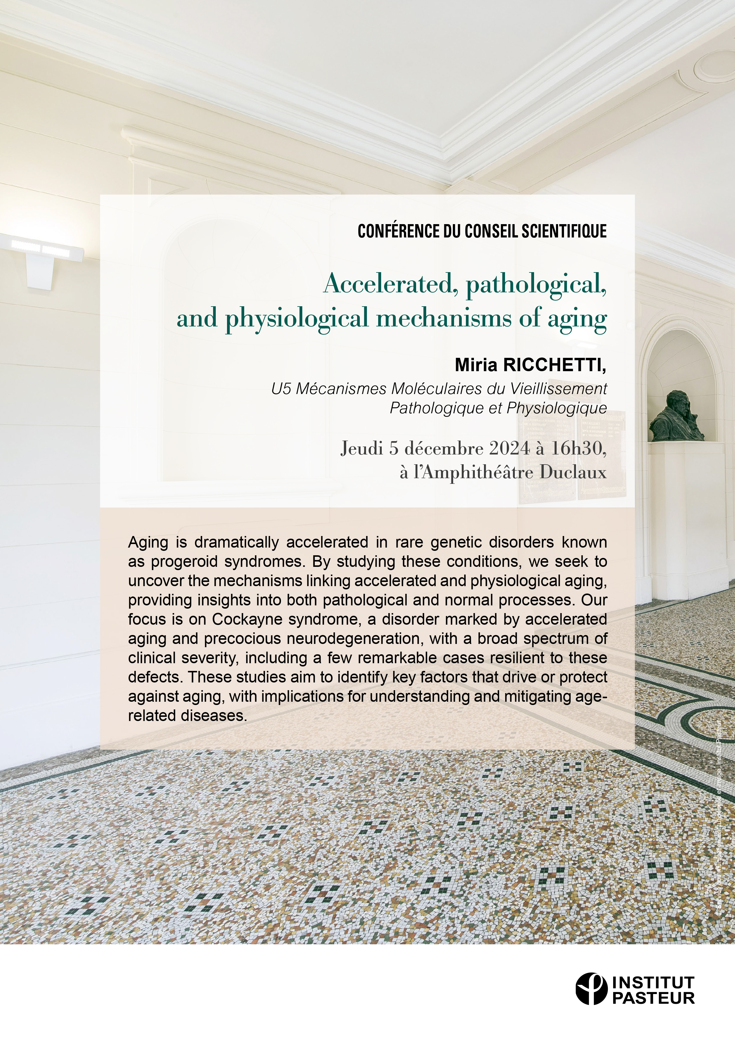 La prochaine conférence intitulée «What precocious ageing diseases tell us of physiological ageing» aura lieu le jeudi 5 décembre, de 16h30 à 17h30,au sein de l’amphithéâtre Émile Duclaux et sera animée par Miria Ricchetti, responsable du l’unité à 5 ans Mécanismes moléculaires du vieillissement pathologique et physiologique.