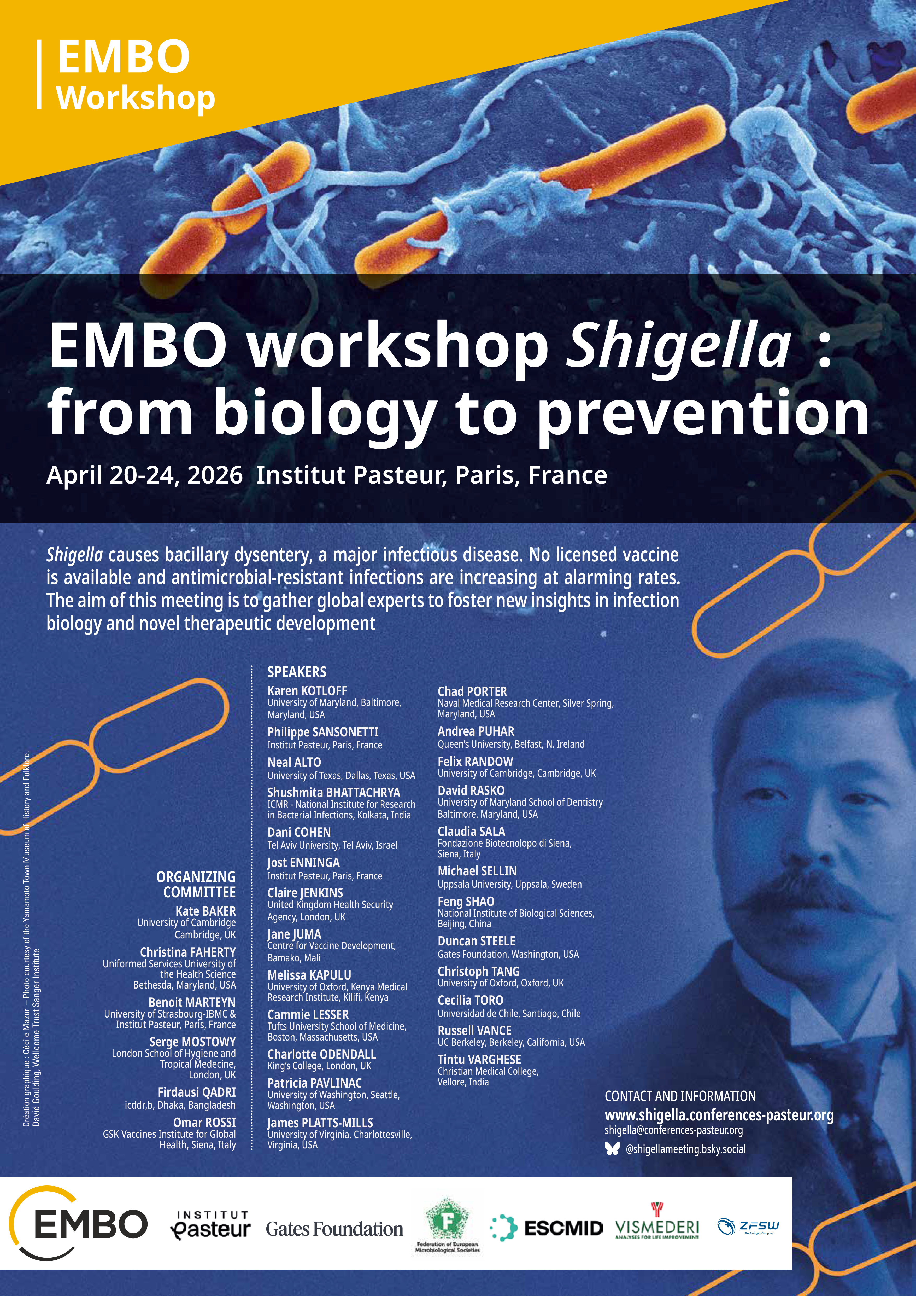 To help generate innovative technologies to combat this formidably persistent pathogen, we need a consolidated research community working collaboratively and sharing expertise across several scientific domains and sectors. To achieve this goal, we are hosting this EMBO Workshop “Shigella: from biology to prevention” to bring together global experts covering all aspects of the pathogen and disease. We will include participants from basic research to public health and industry who will highlight the latest discoveries and development in disease burden, epidemiology and genomic surveillance, fundamental biology, infection models, and vaccines and novel therapeutic approaches. We have assembled a global representation of organizers, scientific advisory members, and speakers to commence this meeting as we attract additional participants across all training levels to successfully hold this inaugural meeting. We encourage submissions of abstracts for selected oral presentations or posters, with options for travel grant applications. The Institut Pasteur was selected as the venue for this first meeting given the rich scientific history and importance in Shigella research. Attendees will be able to learn, present their research, and network with the global Shigella community in the heart of Paris, France, to help foster new scientific and therapeutic endeavors. We look forward to seeing you in Paris in April 2026!