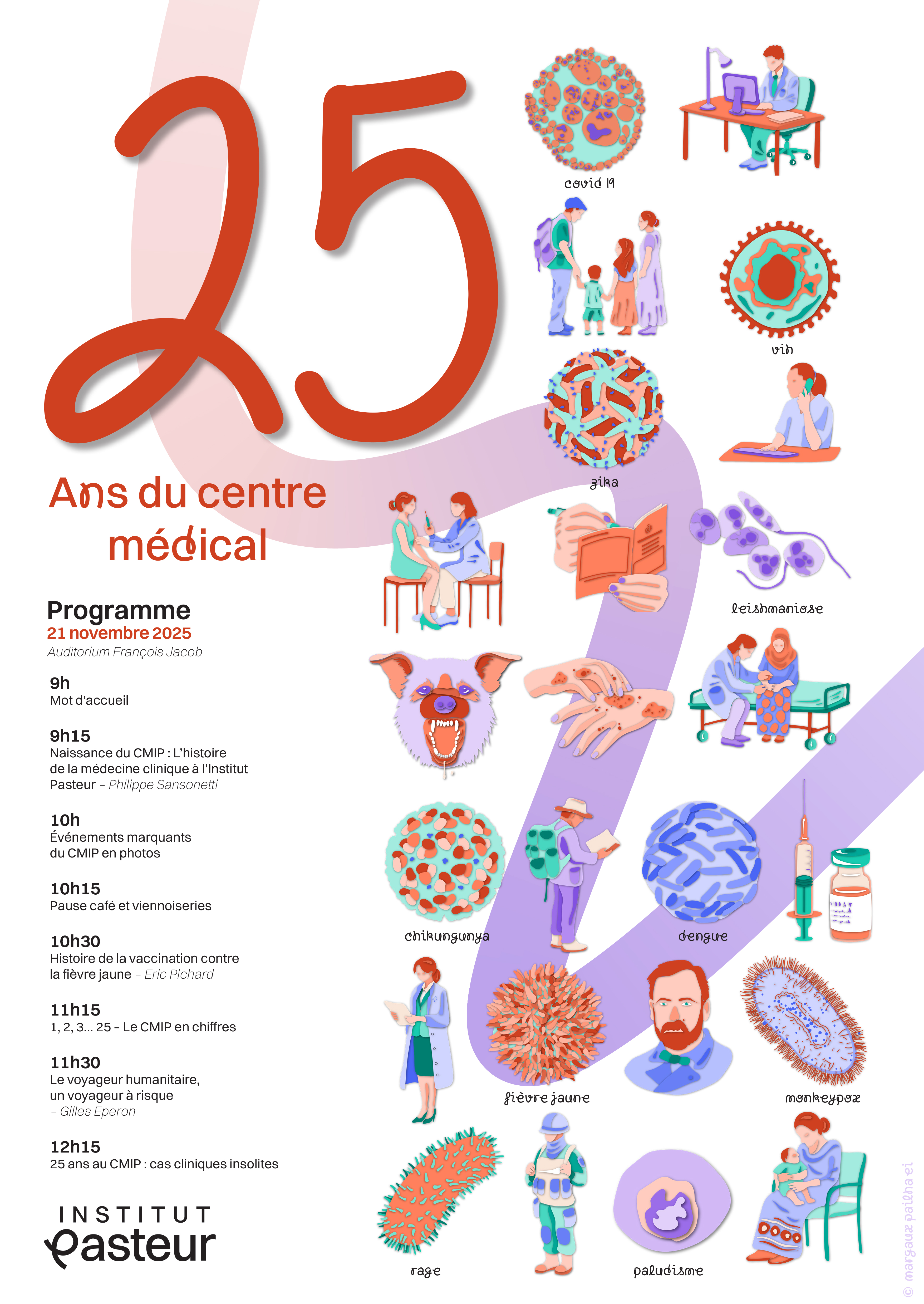 Le centre médical de l’Institut Pasteur (CMIP) fête cette année ses 25 ans d’existence et vous convie le vendredi 21 novembre, de 9h à 13h, dans l’auditorium François Jacob ou en digital via Teams, pour partager un moment convivial mêlant sciences, histoire et souvenirs autour du CMIP.