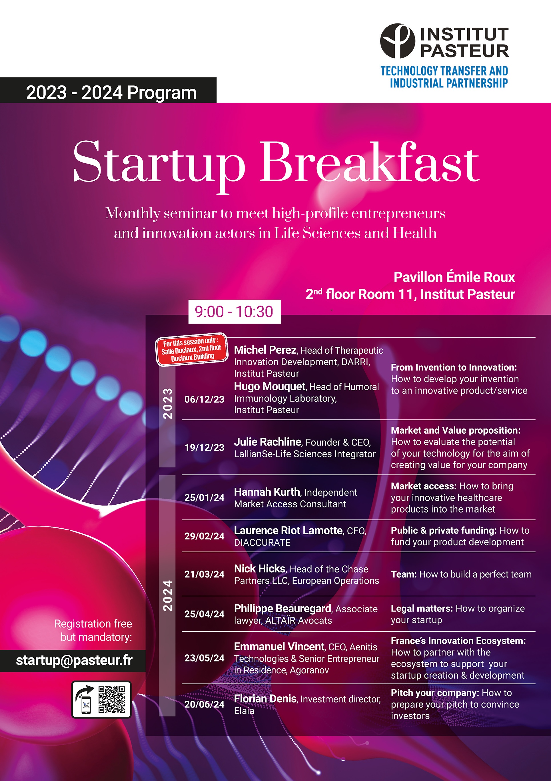 La participation est gratuite avec inscription obligatoire à l’adresse startup@pasteur.fr pour organiser au mieux l’évènement suivant le nombre de participants.