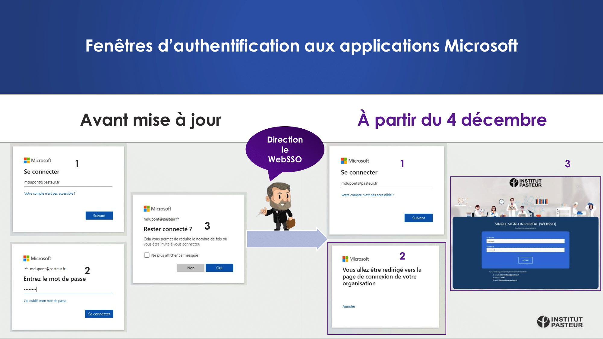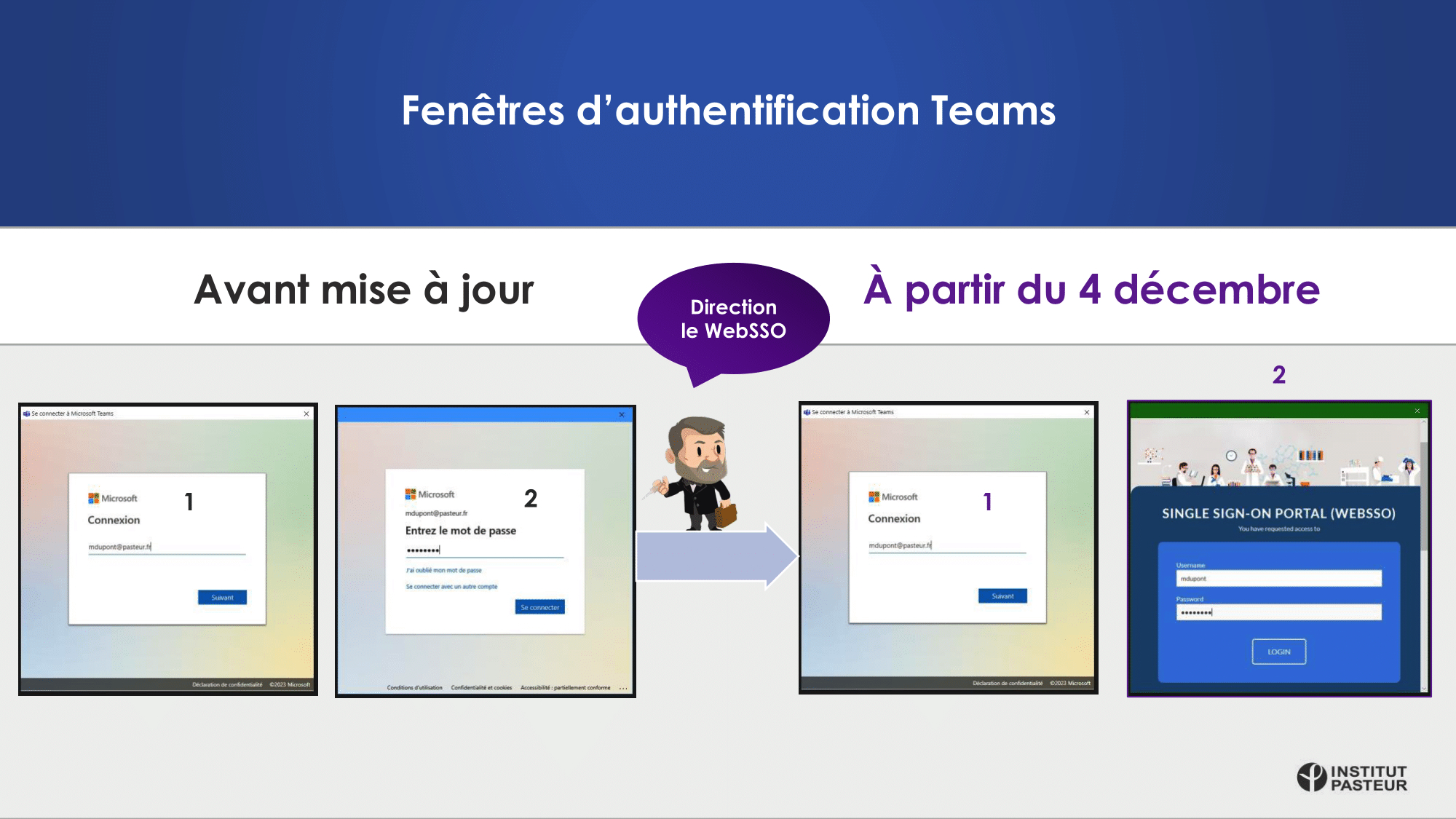 Dans le cadre de la mise en place progressive du MFA (Multi-Factor Authentification) au sein de l’Institut, les équipes de la direction des systèmes d’information (DSI) vous informent que les fenêtres de connexion aux applications web Office 365 (.microsoft.com type Forms, Teams…) et au VPN vont être modifiées pour renvoyer vers la page du WebSSO (PasteurID).