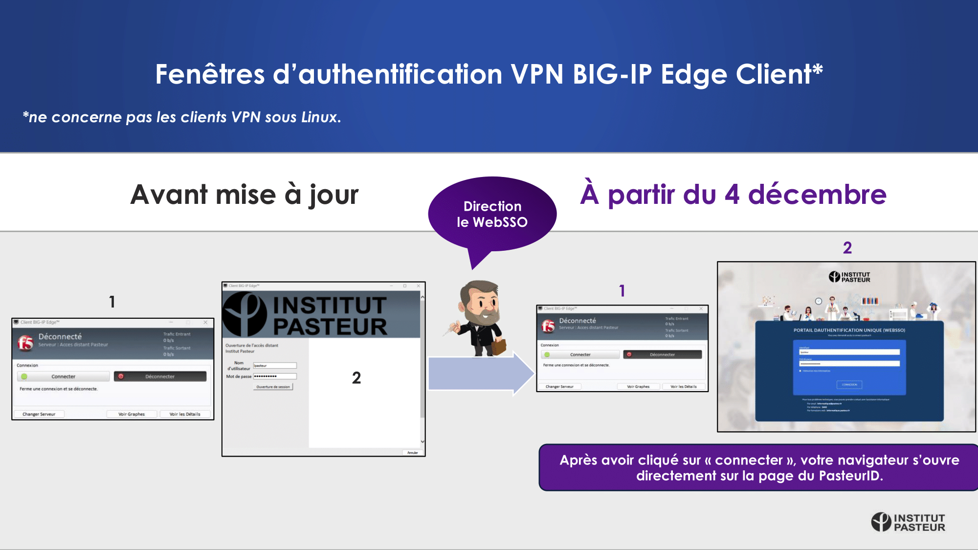 À compter du lundi 4 décembre à 12h, les connections aux services web Microsoft se feront via le PasteurID. Même chose du côté du VPN (Mac & Windows) : après avoir cliqué sur « Connecter », votre navigateur ouvrira un pop-up vous demandant de renseigner votre PasteurID.