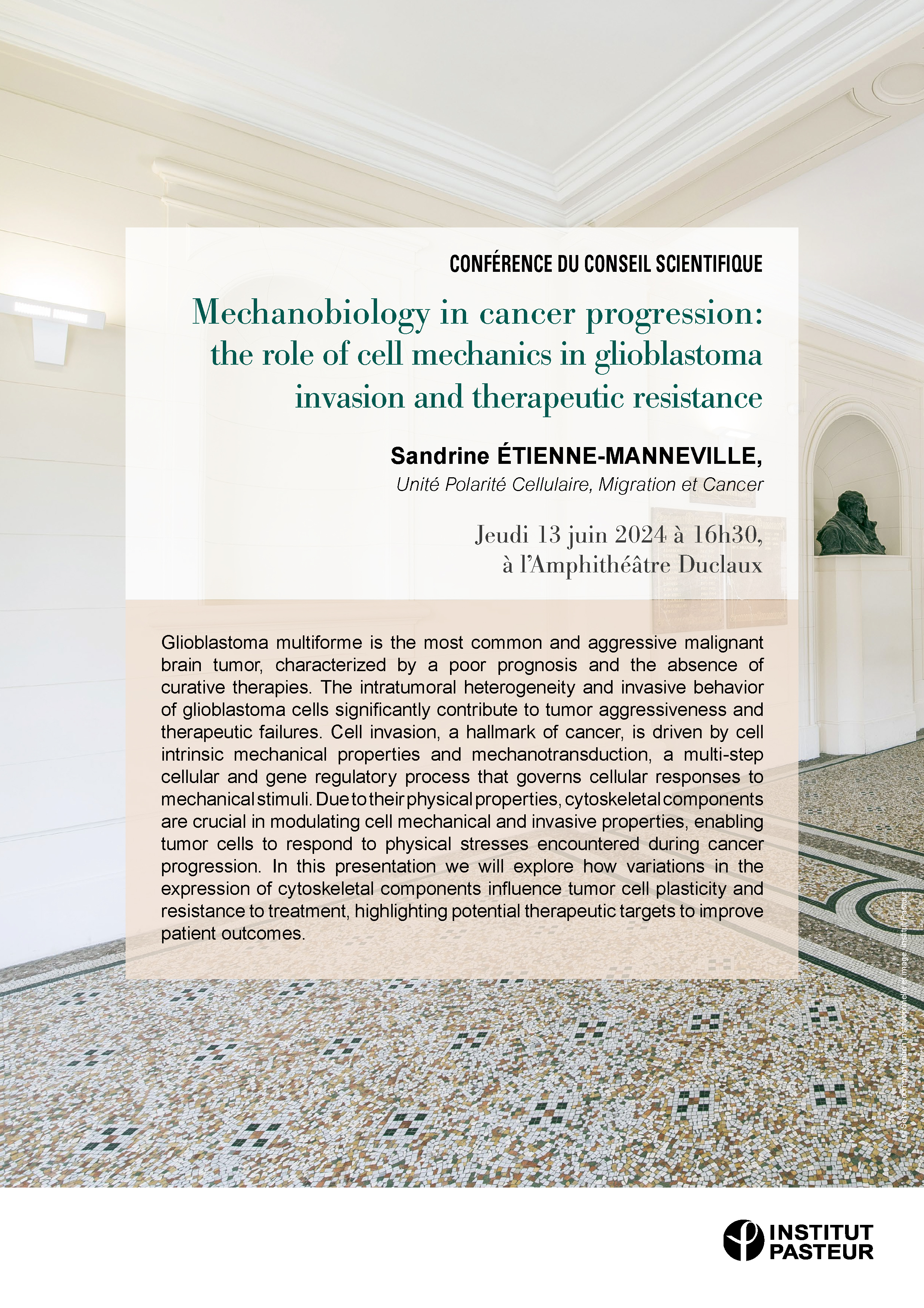 La prochaine conférence intitulée « Mechanobiology in cancer progression: the role of cell mechanics in glioblastoma invasion and therapeutic resistance » aura lieu le jeudi 13 juin et sera animée par Sandrine Etienne-Manneville, responsable de l’unité Polarité cellulaire, migration et cancer