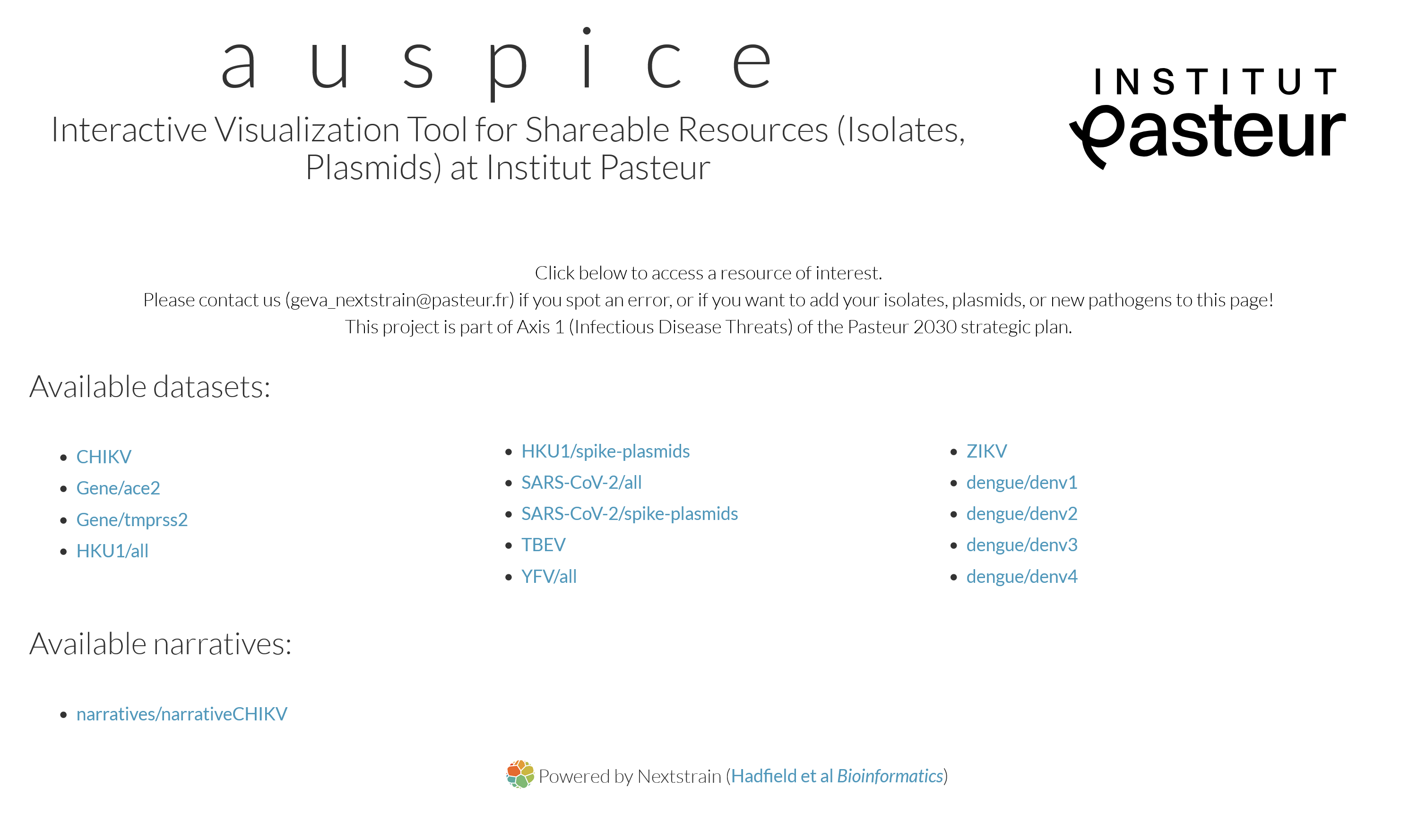 L'équipe de l’unité Génomique évolutive des virus à ARN a le plaisir de vous annoncer le lancement d'une nouvelle page web interne, auspice, conçue pour visualiser des phylogénies (virus, bactéries, gènes) de manière interactive grâce à Nextstrain, une plateforme en open-source. Mis en place par la direction des systèmes d’information (DSI), ce nouvel outil est ouvert à tous les collaborateurs de l’Institut Pasteur. Il s’inscrit dans la priorité scientifique 1 « Menaces infectieuses » du plan stratégique Pasteur 2030.