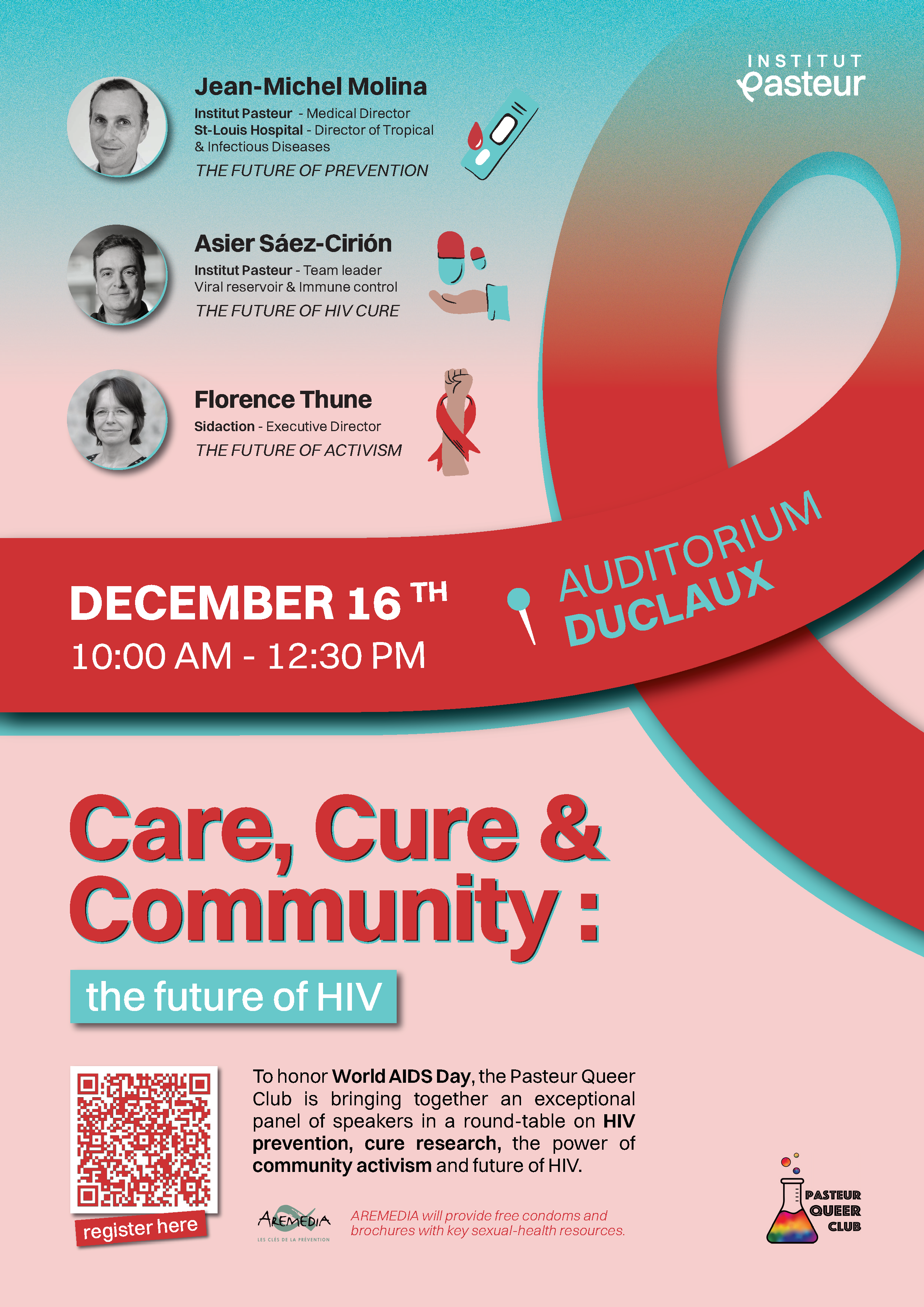 À l’occasion de la Journée mondiale de lutte contre le sida, le Pasteur Queer Club organise une table ronde sur la prévention du VIH, la recherche de traitements et le militantisme, le mardi 16 décembre à 10h dans l’amphithéâtre Émile Duclaux.