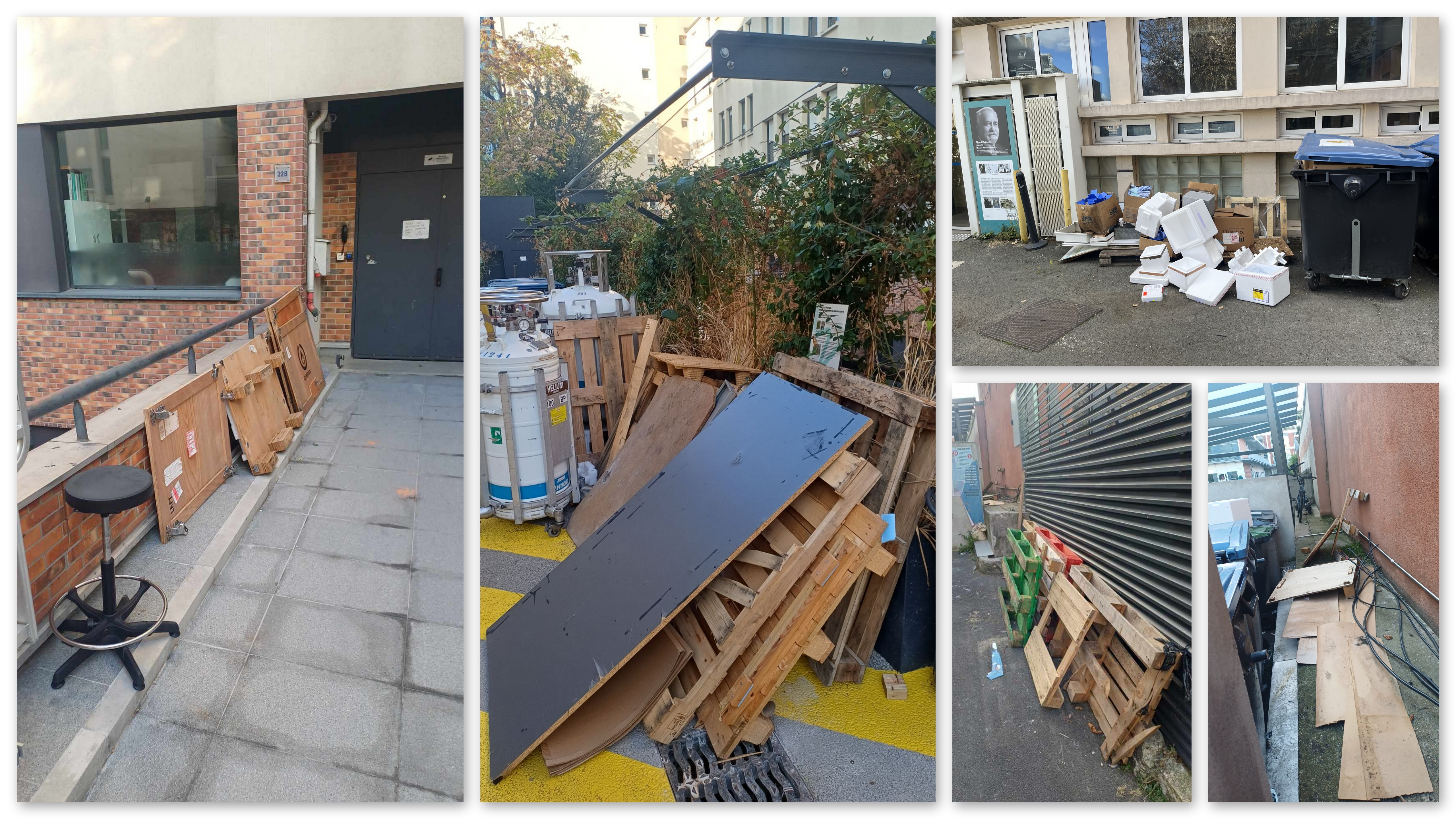 - Mobilier, équipement, caisse ou encombrant : merci de contacter les services généraux du service immobilier et technique (demande d’intervention) pour organiser leur enlèvement et un dépôt, le cas échéant, dans la benne chantier dédiée.
