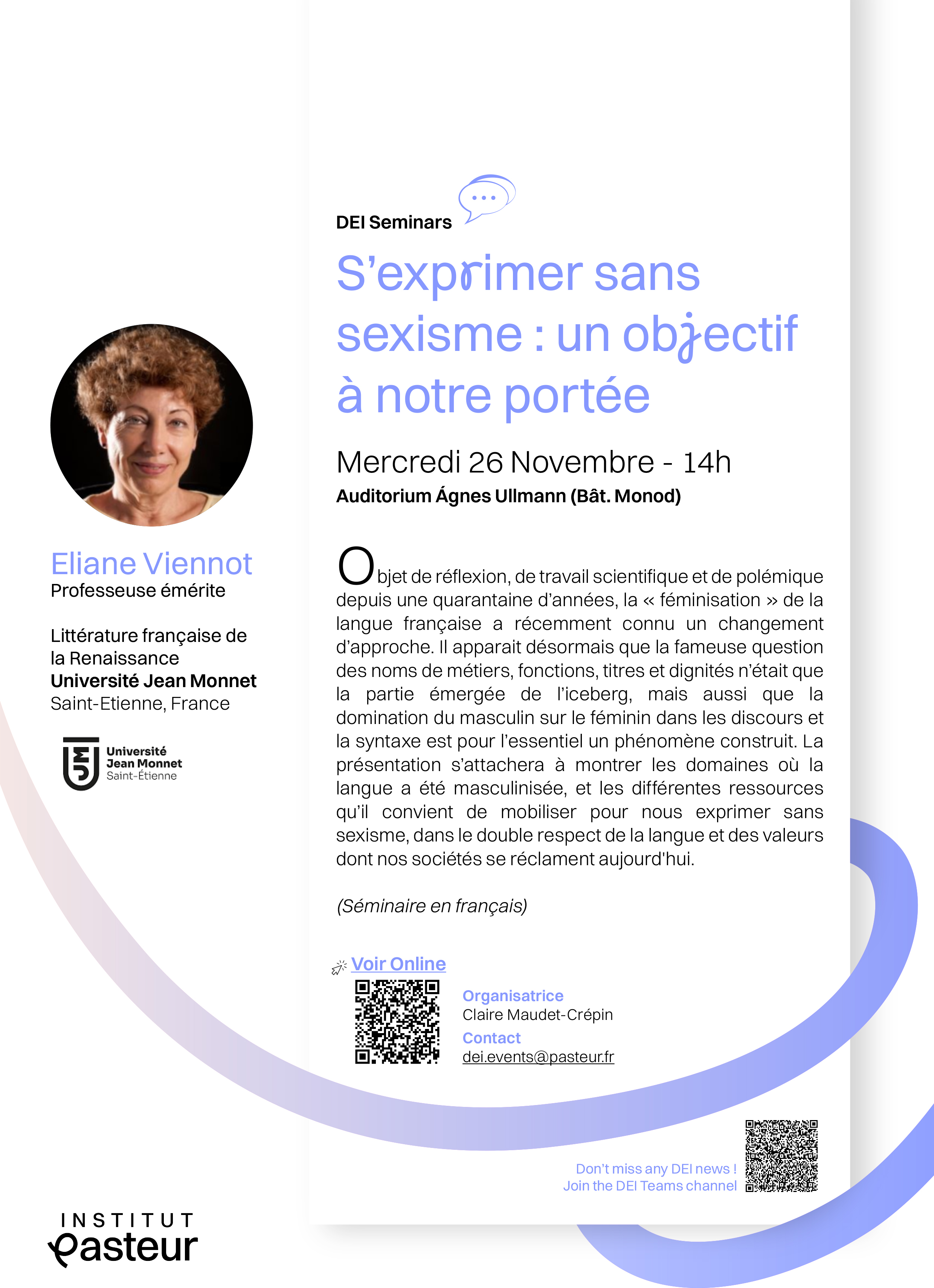 Intervenante : Eliane Viennot, Professeuse émérite de littérature française de la Renaissance de l’université Jean Monnet (Saint-Etienne). Elle a enseigné la grammaire et la littérature française dans les universités de Seattle (USA), Nantes, Corte et Saint-Étienne. Elle a été dix ans membre de l’Institut universitaire de France. Ses recherches portent sur les écrits des princesses de la Renaissance, l’histoire des relations de pouvoir entre les sexes en France, la Querelle des femmes et ses conséquences sur la langue.