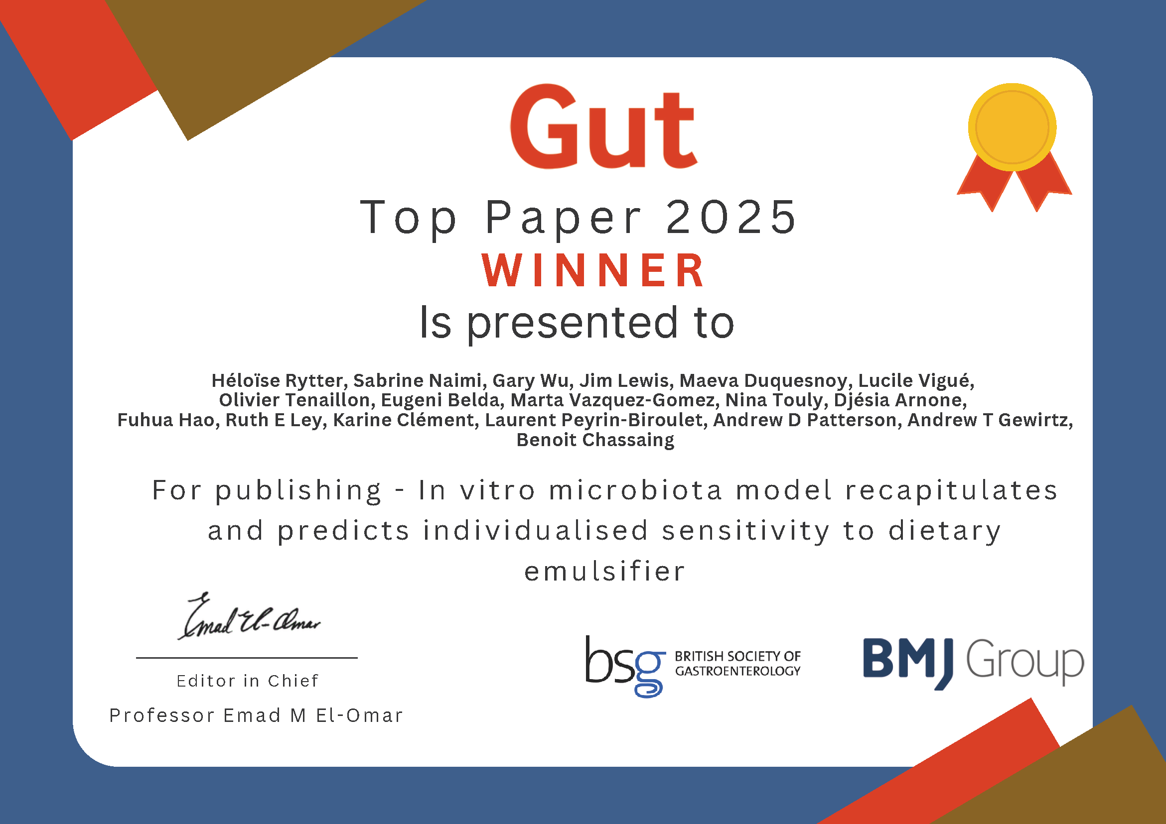 Le 25 décembre dernier, le Professeur Emad El-Omar, éditeur en chef de la revue GUT, aux côté du comité éditorial, a désigné l’article In vitro microbiota model recapitulates and predicts individualised sensitivity to dietary emulsifier en tant que « GUT Top Paper 2025 ».
