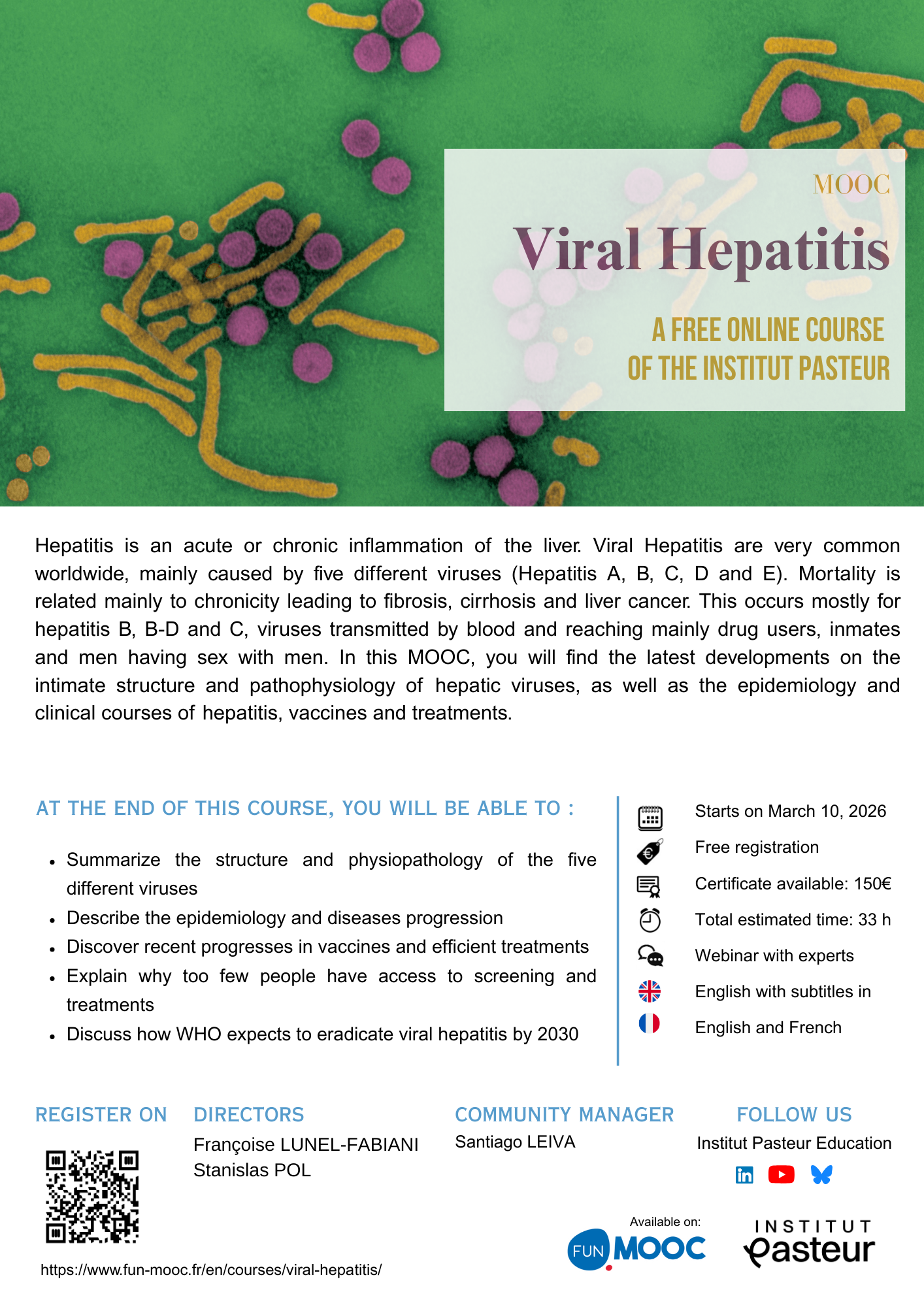 Le pôle de l’enseignement numérique vous invite à vous inscrire à la quatrième édition du MOOC « Viral Hepatitis », largement remaniée et diffusée du 10 mars 2026 au 9 mars 2027.