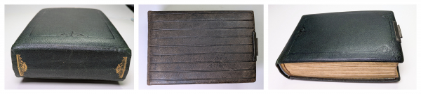 Les trois albums sont structurés de manière similaire : ils possèdent des pages en carton épais avec des fenêtres évidées dans lesquelles les photographies sont glissées. Les feuillets sont reliés par des onglets en carton, joints par du papier marron imitation cuir, et les tranches sont dorées.