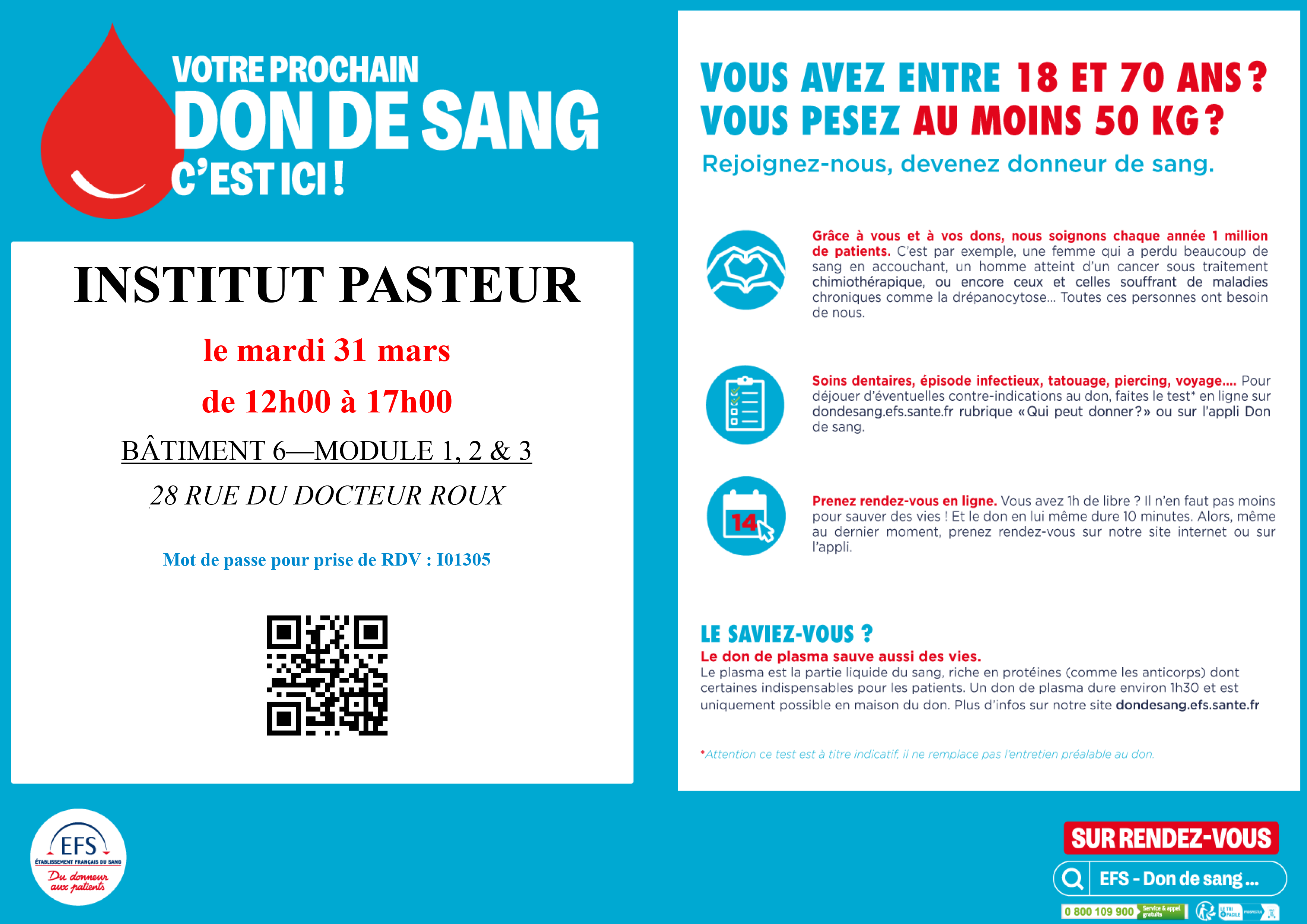 L’Établissement français du sang vous accueillera le mardi 31 mars entre 12h et 17h dans l’espace Congrès (modules 1 & 2 sous la cantine) pour une nouvelle collecte de sang.